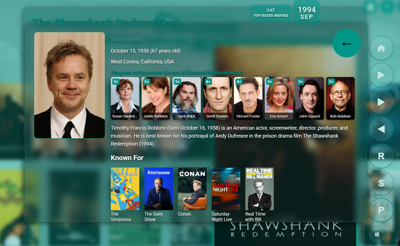 Switch themes instantly with the color ball, tune layouts in the live settings window, preview trailers, listen to audio snippets, and glide through cast rows with full-screen immersion.